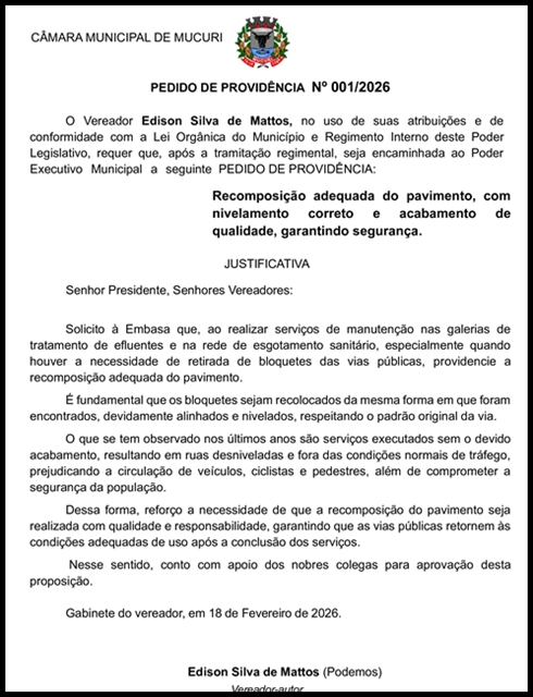 No Pedido de Providência nº 001/2026, apresentado pelo Vereador Edison Silva de Mattos (Sula Policial – Podemos) na sessão desta terça-feira (03/03), foi colocada a necessidade de recomposição adequada do pavimento, com nivelamento correto e acabamento de qualidade, em obras realizadas pela Embasa no município de Mucuri, para garantia da segurança dos munícipes.
