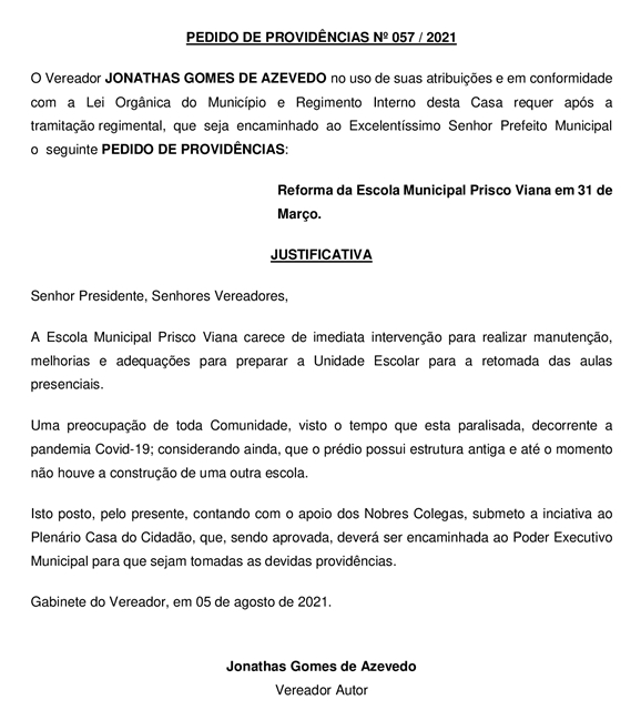 Vereador também pediu reforma da Escola Prisco Viana