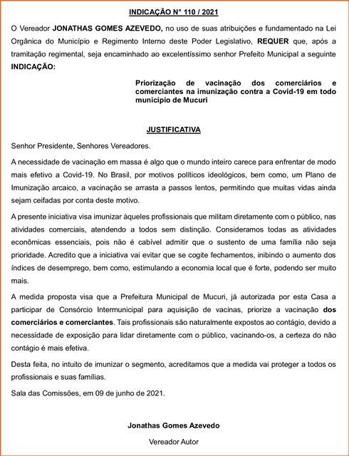 Prioridade na vacinação dos comerciários e comerciantes, dentro do plano de imunização contra a Covid-19 em todo município de Mucuri, foi o teor da Indicação nº 110/2021, apresentada pelo Vereador Jonathas Gomes Azevedo (Dhow da Divisa – PROS).