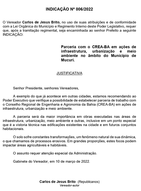 Parceria com o CREA-BA em ações de infraestrutura, urbanização e meio ambiente no âmbito do Município de Mucuri;