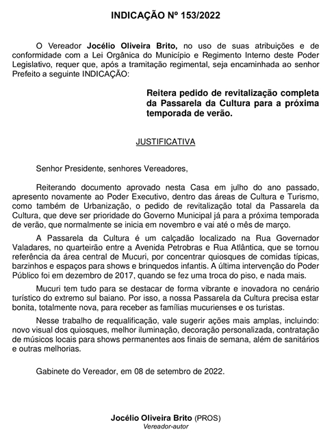 Nº 153/2022, de autoria do Vereador Jocélio Oliveira Brito dispondo sobre: Reitera pedido de revitalização completa da Passarela da Cultura para a próxima temporada de verão.