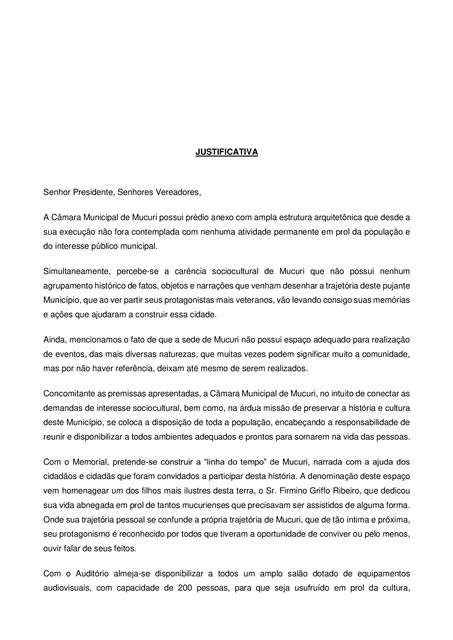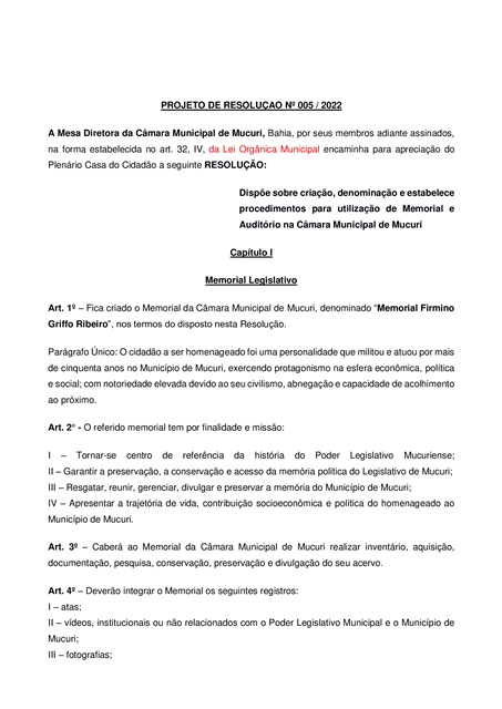 De acordo com o art. 1º do documento, fica criado o Memorial da Câmara Municipal de Mucuri, denominado “Memorial Firmino Griffo Ribeiro”, homenagem ao ex-prefeito, falecido em 09 de março deste ano, personalidade que militou e atuou por mais de 50 anos no Município, exercendo protagonismo na esfera econômica, política e social; com notoriedade elevada devido ao seu civilismo, abnegação e capacidade de acolhimento ao próximo.