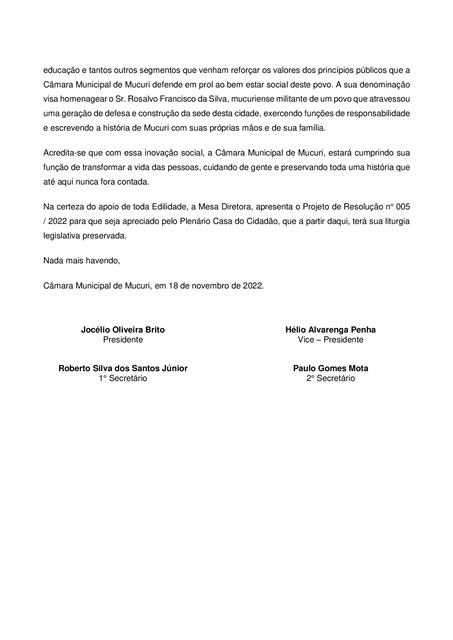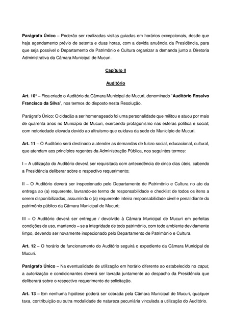 O art. 10º do Projeto de Resolução cria, também, o Auditório da Câmara, denominado “Auditório Rosalvo Francisco da Silva”, ex-vereador por dois mandatos e pessoa de destaque na conjuntura sociopolítica de Mucuri.