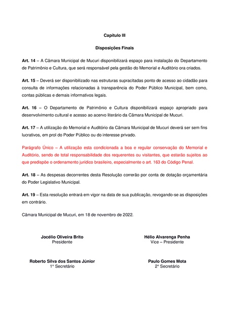 Foi aprovado com o voto de todos os Vereadores presentes à 30ª Reunião Ordinária, realizada nessa terça-feira (13/12), o Projeto de Resolução nº 005/2022, que dispõe sobre a criação, denominação e estabelece procedimentos para utilização de Memorial e Auditório na Câmara Municipal de Mucuri.