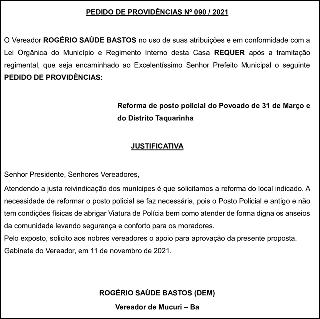 Obras de reforma dos postos policiais do povoado de 31 de Março (Divisa) e do distrito de Taquarinha foram reivindicadas pelo Vereador Rogério Saúde Bastos (Rogério de Nicó – DEM), autor do Pedido de Providências nº 090/2021, aprovado na sessão de terça-feira passada (16/11) da Câmara.