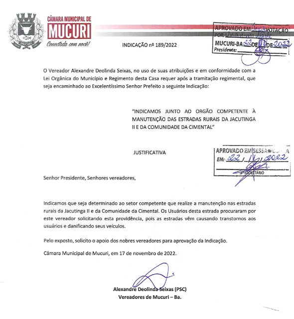 Indicamos junto ao órgão competente à manutenção das estradas rurais da Jacutinga II e da comunidade da Cimental.