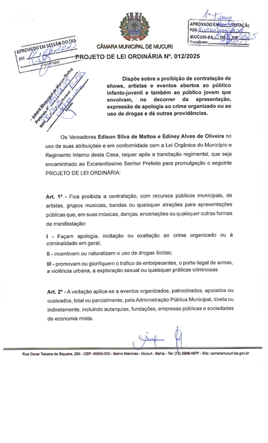 Aprovado em 1º turno na Câmara, durante a reunião desta terça-feira (19/08), o Projeto de Lei Ordinária nº 012/2025, que dispõe sobre a proibição de contratação de shows, artistas e eventos abertos ao público infanto-juvenil e também ao público jovem que envolvam, no decorrer da apresentação, expressão de apologia ao crime organizado ou ao uso de drogas.