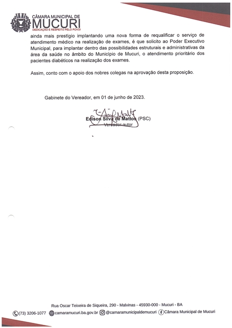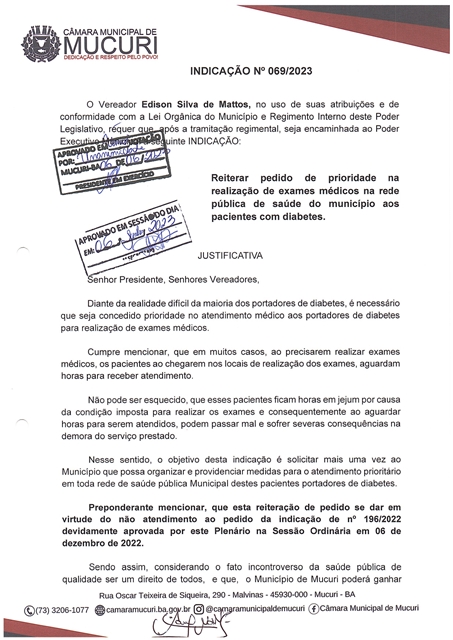 A Indicação nº 069/2023 reitera pedido de prioridade na realização de exames médicos aos pacientes com diabetes na rede pública de Saúde do Município.