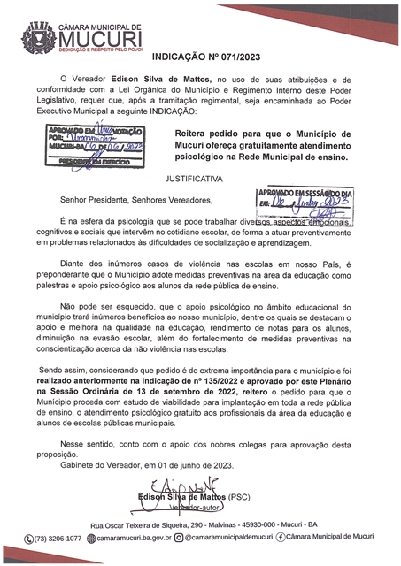 A Indicação nº 071/2023 reitera pedido para que o Município ofereça gratuitamente atendimento psicológico na rede municipal de ensino.