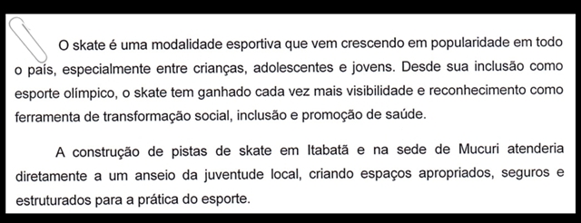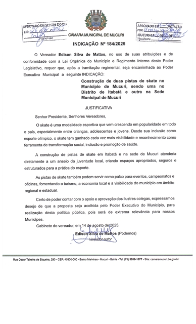 Aprovada por unanimidade na sessão desta terça-feira (26/08) a Indicação nº 184/2025, autoria do Vereador Edison Silva de Mattos (Sula Policial – Podemos) que propõe ao Prefeito a construção de duas pistas de skate no Município, sendo uma no distrito de Itabatã e outra em Mucuri-sede.