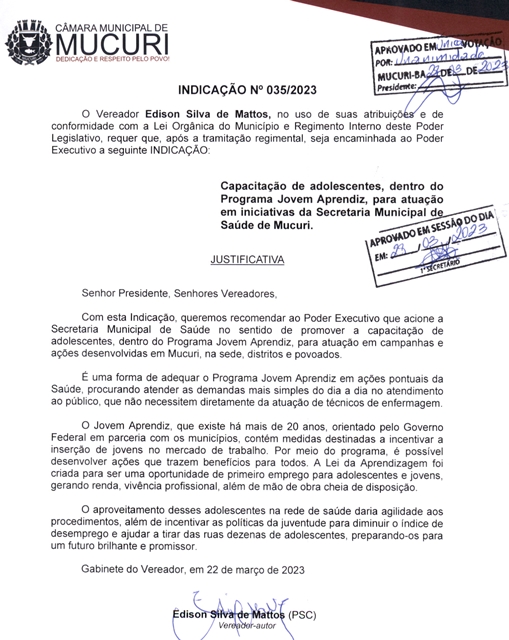 Um programa de capacitação de adolescentes, dentro do Programa Jovem Aprendiz, para atuação em iniciativas da Secretaria Municipal de Saúde de Mucuri foi proposto pelo Vereador Edison Silva de Mattos (Sula – PSC) com a Indicação nº 035/2023, aprovada na 5ª Reunião Ordinária, terça-feira passada (28/03).