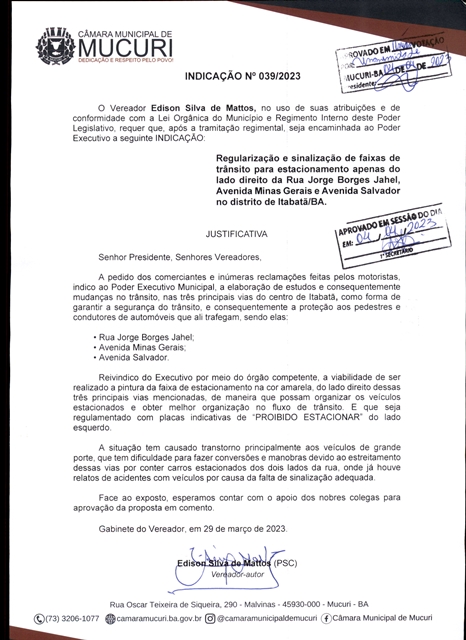 Com a Indicação nº 039/2023, Sula orientou sobre a regularização e sinalização de faixas de trânsito para estacionamento apenas do lado direito da Rua Jorge Borges Jahel, da Avenida Minas Gerais e da Avenida Salvador, na área central do distrito de Itabatã.