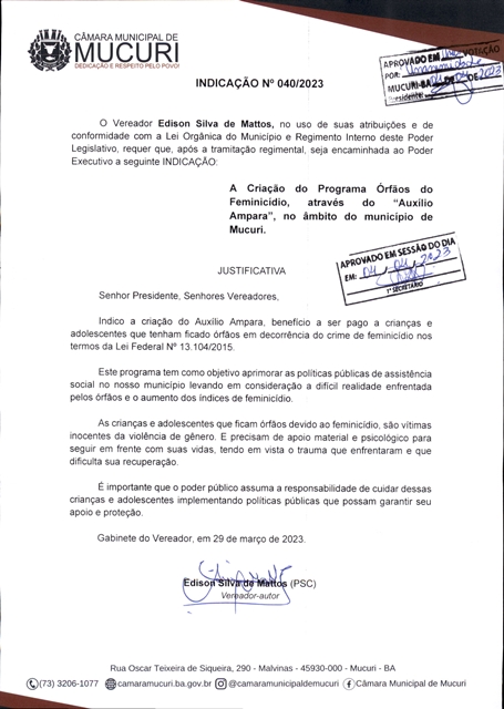 A outra Indicação de Sula (nº 040/2023) dispõe sobre a criação do Programa Órfãos do Feminicídio, através do “Auxílio Ampara”, no âmbito do município de Mucuri.