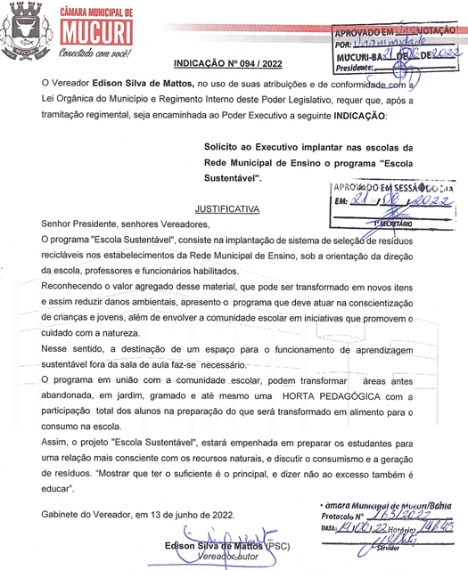 A implantação nas escolas da rede municipal de ensino do programa “Escola Sustentável” foi proposta pelo Vereador Edison Silva de Mattos (Sula – PSC), ao apresentar a Indicação nº 094/2022, aprovada por unanimidade na Reunião Ordinária dessa terça-feira (21).