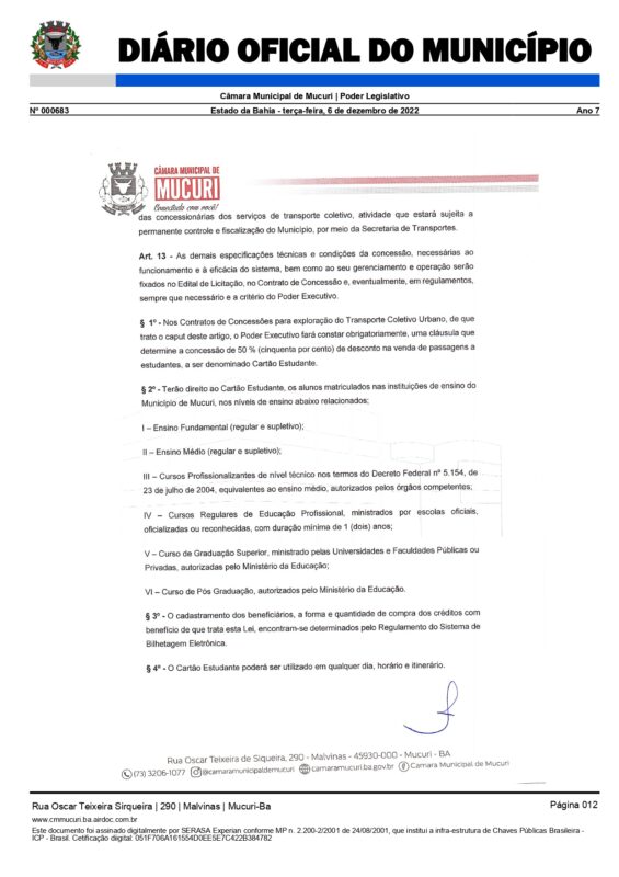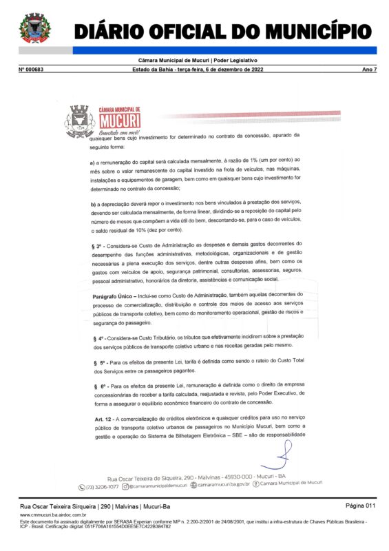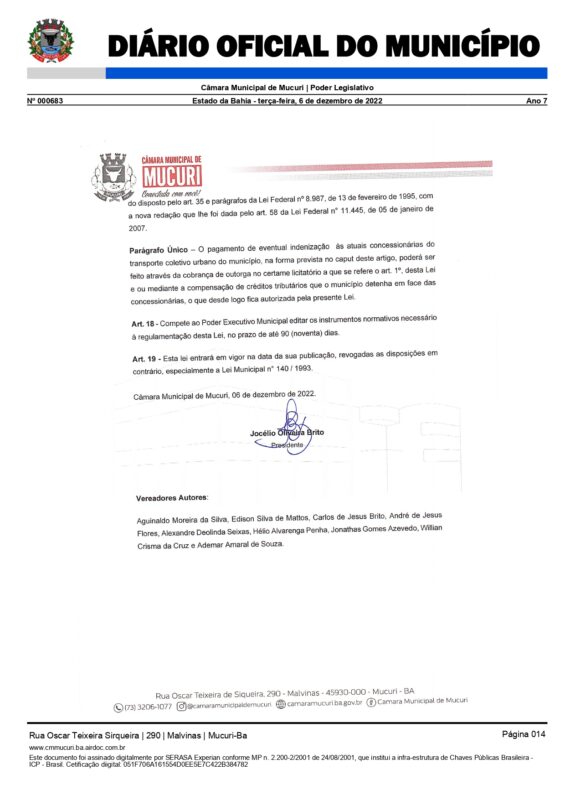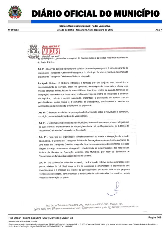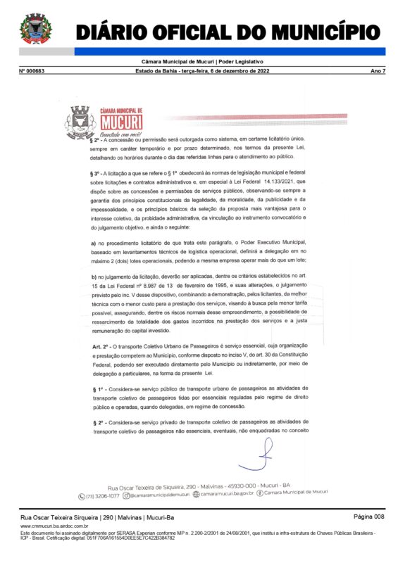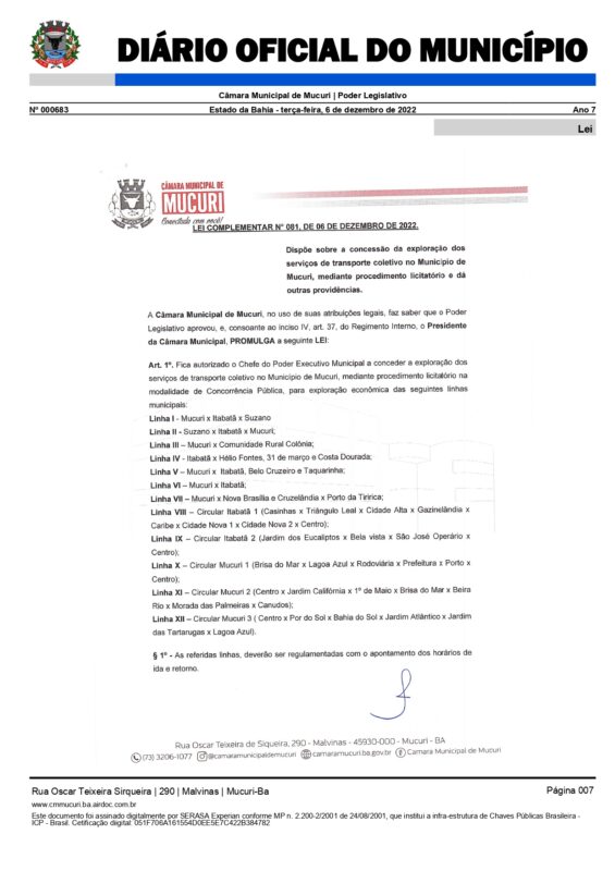 Foi promulgada pelo Poder Legislativo desde o dia 6 de dezembro do ano passado a Lei Complementar nº 081/2022, que define normas relativas à exploração dos serviços de transporte coletivo no Município de Mucuri, mediante procedimento licitatório.