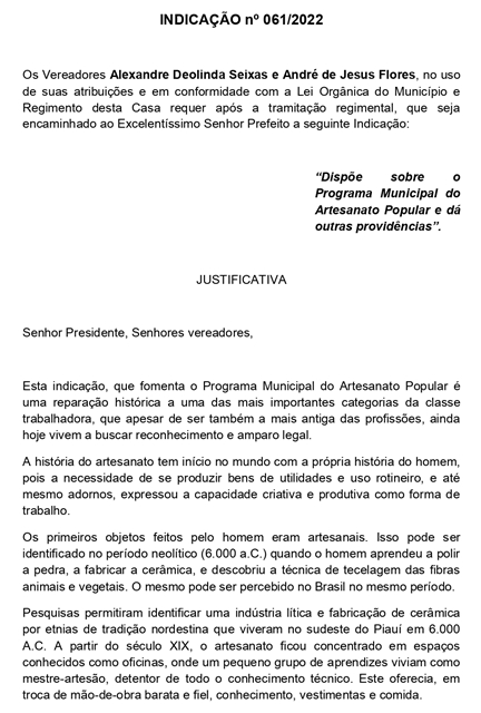 Parceria dos Vereadores Alexandre Deolinda Seixas (Xandão Seixas – PSC) e André de Jesus Flores (André do Sindicato – Rede) resultou na Indicação nº 061/2022, aprovada na sessão de terça-feira (10/05) da Câmara. O documento trata da instituição do Programa Municipal do Artesanato Popular em Mucuri.
