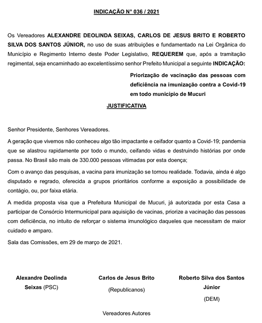 Assunto: Priorização de vacinação das pessoas com deficiência na imunização contra a Covid-19 em todo município de Mucuri.