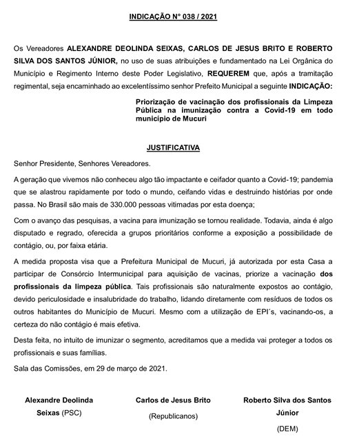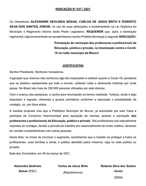 Dentro do plano municipal de vacinação contra a Covid-19, os Vereadores Alexandre Deolinda Seixas (Xandão Seixas – PSC), Carlos de Jesus Brito (Carlinhos da Ótica – Republicanos) e Roberto Silva dos Santos Júnior (Roberto Jr. – DEM) apresentaram indicações recomendando a inclusão dos professores e demais profissionais da Educação pública e privada, dos trabalhadores da Limpeza Pública e de pessoas com deficiência nos grupos prioritários.