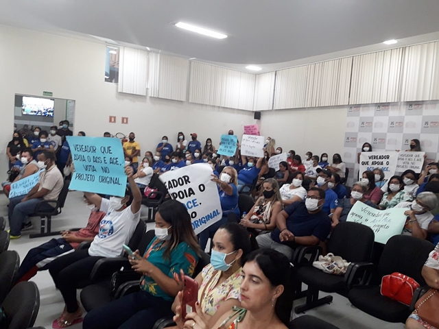 Os servidores da Saúde, principalmente das categorias ACS e ACE, superlotaram as dependências da Câmara, exibindo cartazes em defesa da aprovação do texto original do PLC 009.