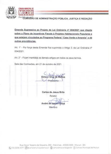 O Projeto foi aprovado com Emenda Supressiva da Comissão de Administração Pública, Justiça e Redação, que suprimiu o art. 3º do seu texto original, onde se previa a dispensa do pagamento de tributos como ISSQN, IPTU e ITBI.