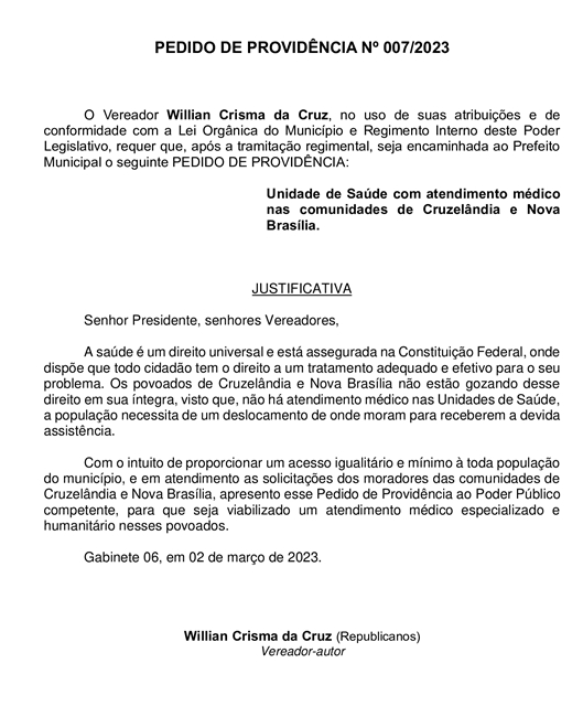 O Pedido de Providência nº 007/2023 cobra Unidade de Saúde com atendimento médico nos dois povoados.