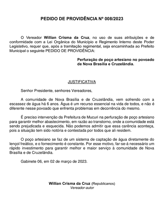 Já o Pedido de Providência nº 008/2023 refere-se à necessidade de perfuração de poços artesianos nas localidades.