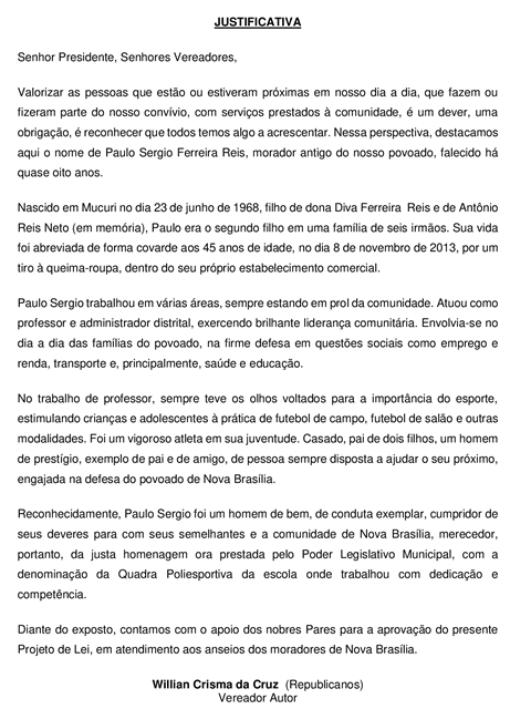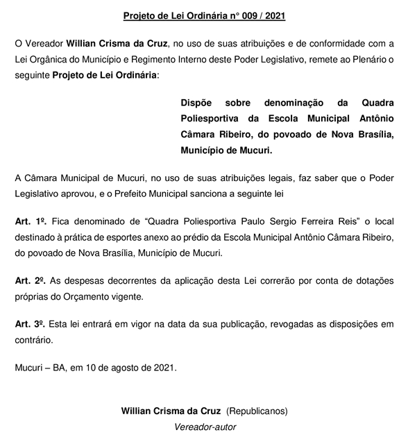 A Câmara de Mucuri aprovou por unanimidade, durante reunião de terça-feira passada (21/9), o Projeto de Lei Ordinária nº 009/2021, autoria do vereador Willian Crisma da Cruz (Willian Crisma – Republicanos), que oficializa a nova denominação da “Quadra Poliesportiva Paulo Sergio Ferreira Reis”, da Escola Municipal Antônio Câmara Ribeiro, do povoado de Nova Brasília.