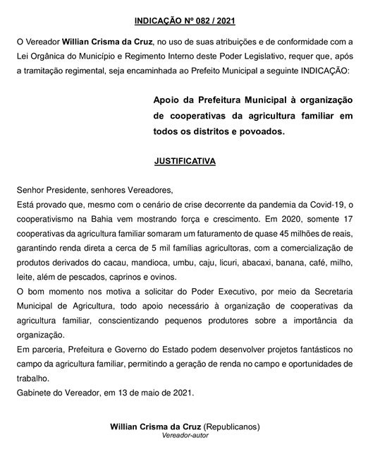 A necessidade de um apoio da Prefeitura Municipal de Mucuri à organização de cooperativas da agricultura familiar em todos os distritos e povoados foi defendida na reunião desta terça-feira (18) pelo Vereador Willian Crisma da Cruz (Willian Crisma – Republicanos), autor da Indicação nº 082/2021.