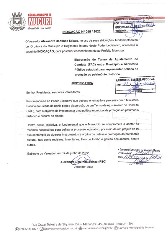 É de autoria do Vereador Alexandre Deolinda Seixas (Xandão Seixas – PSC) a Indicação nº 095/2022, que trata da elaboração de um Termo de Ajustamento de Conduta (TAC) entre o Município e o Ministério Público estadual, para implementar política de proteção ao patrimônio histórico.