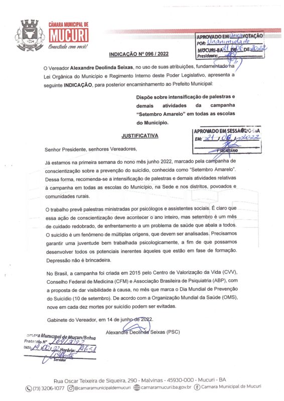Em outra Indicação – Nº 096/2022 -, Xandão defende, desde já, a intensificação de palestras e demais atividades da campanha “Setembro Amarelo” em todas as escolas do Município.