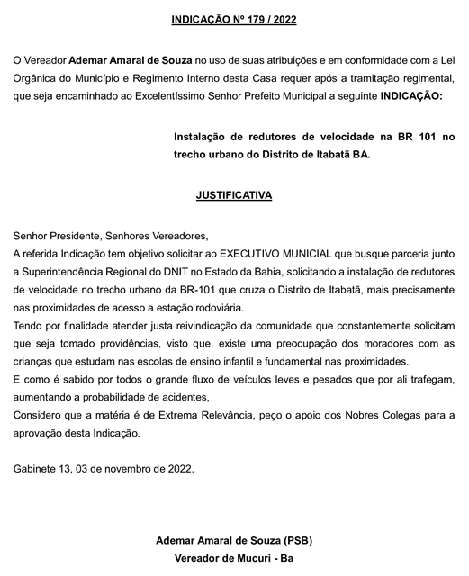 A preocupação com a segurança dos pedestres e organização do fluxo de veículos na BR-101, no perímetro urbano de Itabatã, motivou o Vereador Ademar Amaral de Souza (Amaral – PSD) a apresentar na Câmara, durante a 27ª Reunião Ordinária, realizada nessa terça-feira (22/11), a Indicação nº 179/2022, na qual pediu a instalação de redutores de velocidade na rodovia que corta o distrito.