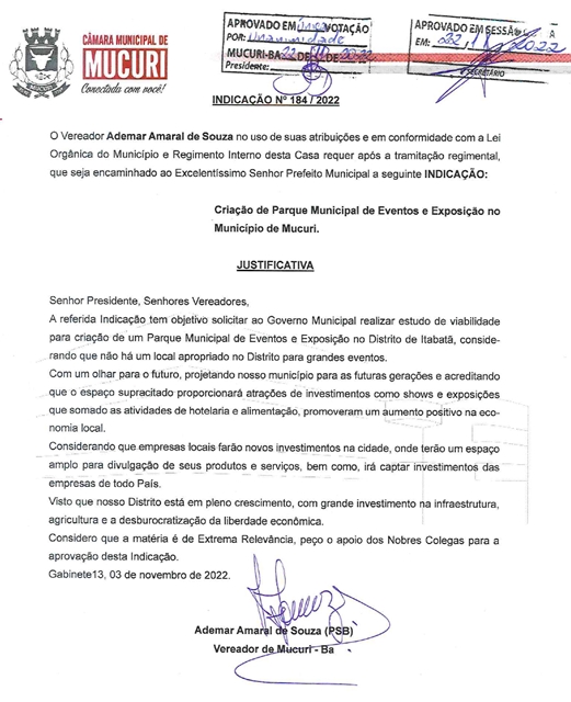 Em outro documento – Indicação nº 184/2022 –, Amaral cobrou do Poder Executivo a instalação de um Parque Municipal de Eventos e Exposições no Município, como local de referência para tais realizações.