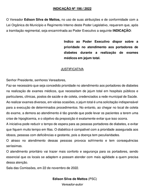 Já a Indicação nº 196/2022 solicita a prioridade no atendimento aos portadores de diabetes durante a realização de exames médicos em jejum total.