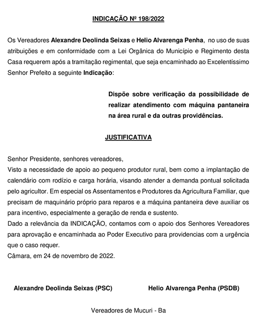 Aprovada por unanimidade na Reunião de terça-feira passada (06/12) a Indicação nº 198/2022, autoria conjunta dos Vereadores Alexandre Deolinda Seixas (Xandão Seixas – PSC) e Hélio Alvarenga Penha (Dr. Hélio – PSDB), que solicita ao Poder Executivo a verificação da possibilidade de realizar atendimento com máquina pantaneira na área rural de Mucuri.