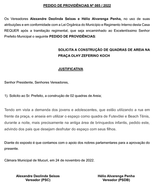 Xandão Seixas e Dr. Hélio também assinaram em conjunto o Pedido de Providência nº 085/2022, no qual solicitam a construção de quadras de areia na Praça Olhy Zeferino Koch, também conhecida como “Praça do Bradesco”, no centro histórico de Mucuri.