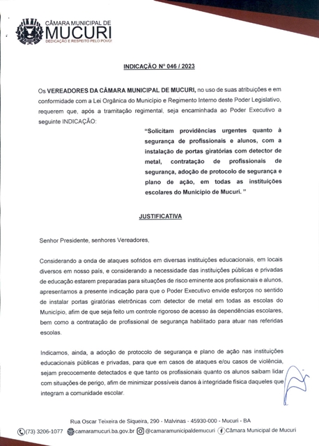 O documento solicita ao prefeito Roberto Carlos Figueiredo Costa que sejam tomadas providências urgentes quanto à segurança de profissionais e alunos dos estabelecimentos de ensino, com a instalação de portas giratórias com detector de metal, contratação de profissionais de segurança, adoção de protocolo de segurança e plano de ação, em todas as escolas de Mucuri.