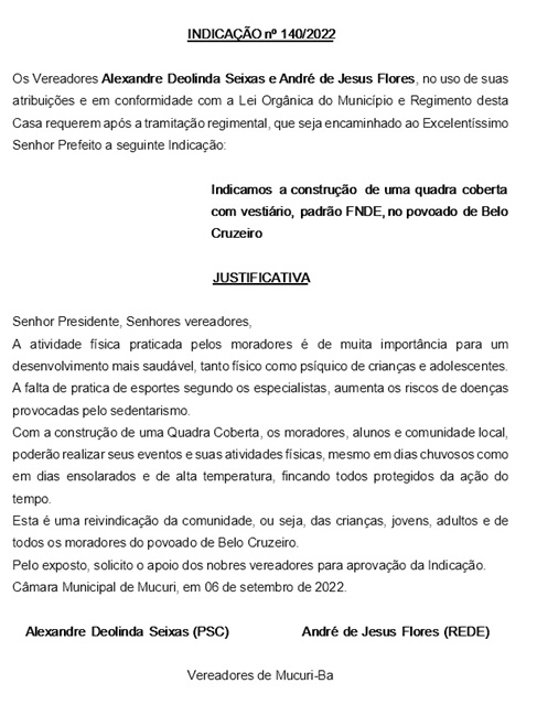 Aprovada por todos os Vereadores presentes à sessão de terça-feira (13/09) a Indicação nº 140/2022, assinada por Alexandre Deolinda Seixas (Xandão Seixas – PSC) e André de Jesus Flores (André do Sindicato – Rede). O documento solicita do Prefeito Municipal a construção de uma quadra coberta com vestiário, padrão FNDE, no povoado de Belo Cruzeiro.
