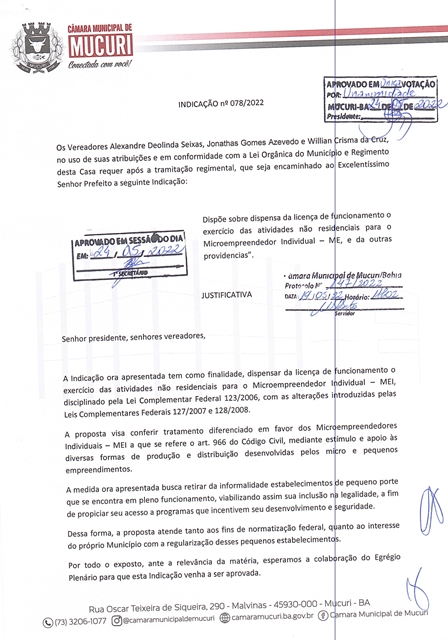 Com a Indicação nº 078/2022, aprovada na tarde de terça-feira (24/05) durante a sessão ordinária da Câmara, os Vereadores Alexandre Deolinda Seixas (Xandão Seixas – PSC), Jonathas Gomes Azevedo (Dhow da Divisa – PROS) e Willian Crisma da Cruz (Willian Crisma – Republicanos) recomendam dispensa da licença de funcionamento o exercício das atividades não residenciais para o Microempreendedor Individual – MEI.